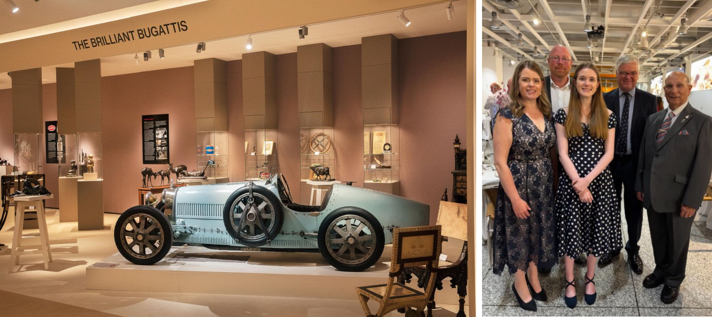 ‘The Brilliant Bugattis’ exhibition in London, curated by the Sladmore Gallery and supported by the Trust, was part of this year’s Treasure House Fair. (Photo © Sladmore Gallery). Second image: The 2025 Pre-16 Learner Of The Year Award sponsored by The Bugatti Trust at the JCB Academy went to Daisy Gallimore seen here with her family, Trust Chairman Allan Rippon and Clive Rollinson. Huge congratulations!
