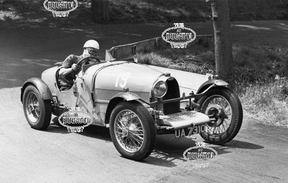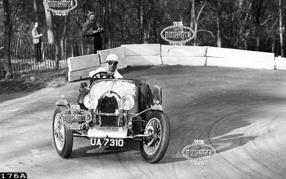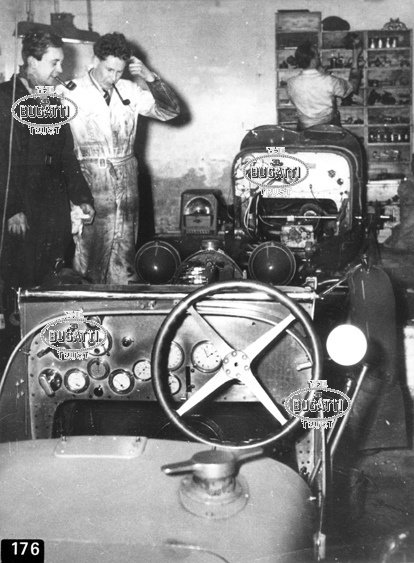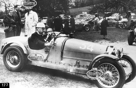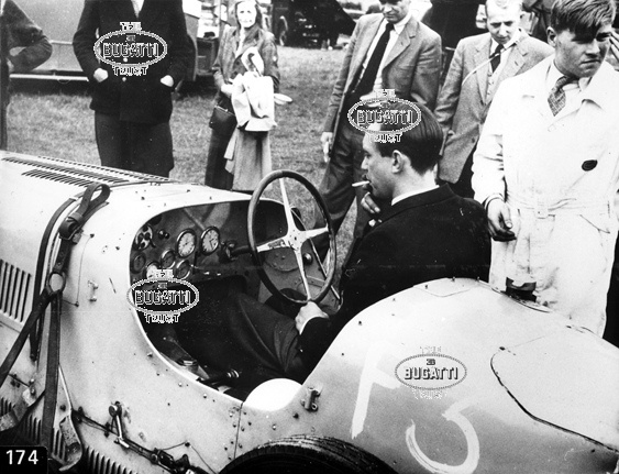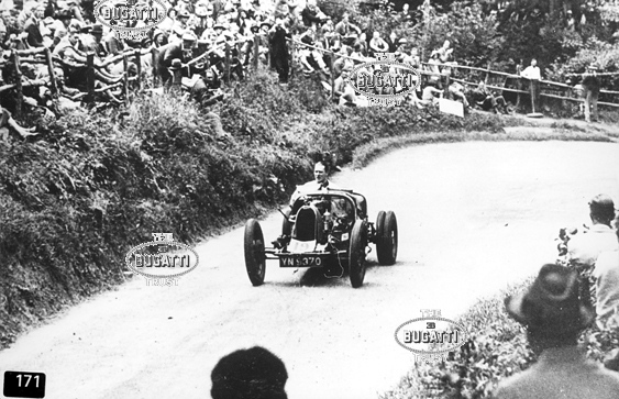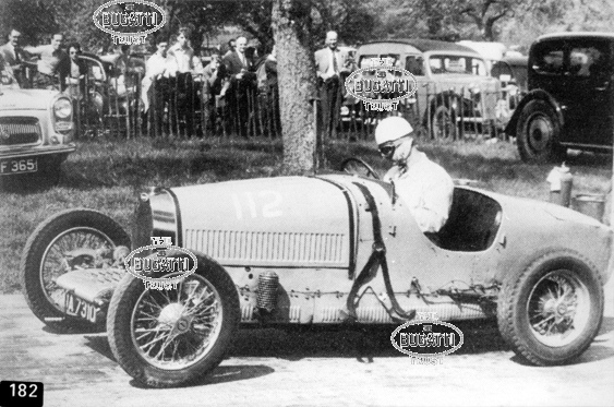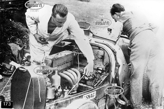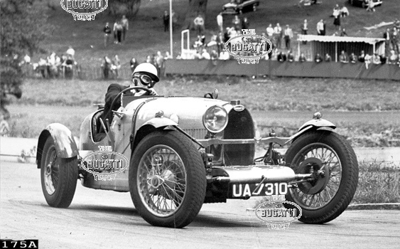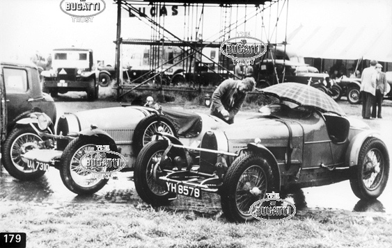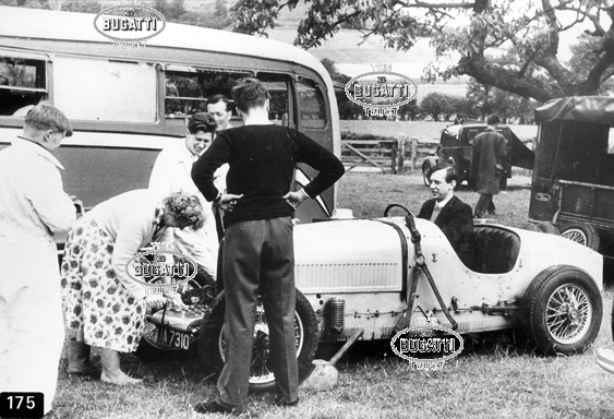 Peter Gaskell with Kaye Stubberfield on the starting handle. Prescott paddock. John Judd in background with Vickers-Green. Inter-club meeting July 1957.